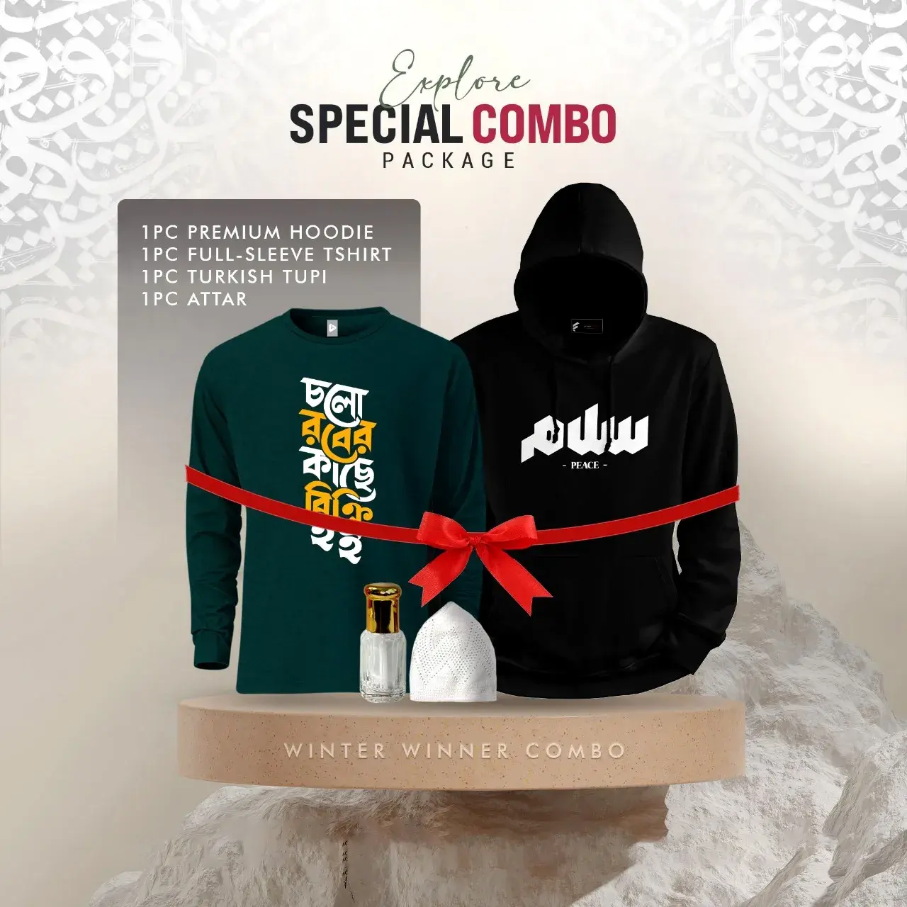 ১টি প্রিমিয়াম হুডি, ১টি প্রিমিয়াম ফুলহাতা টি'শার্ট, ১টি আতর (কম্বো প্যাক)