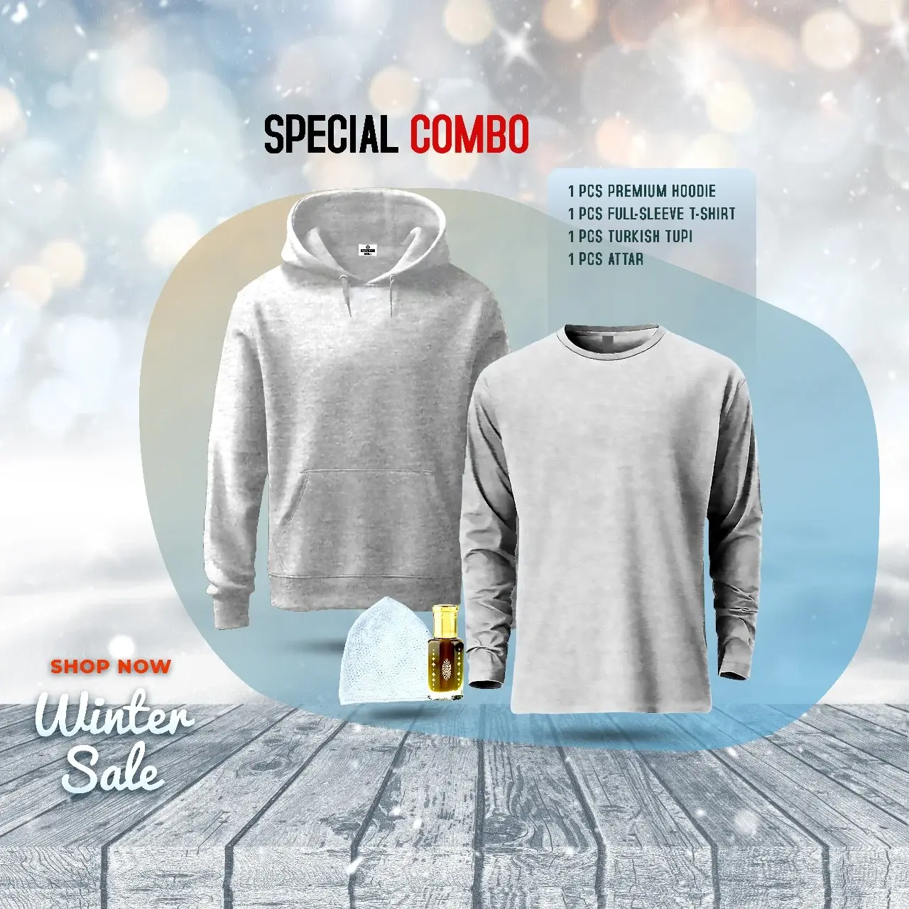 ""শীতের আভিজাত্য"": ১টি প্রিমিয়াম হুডি, ১টি প্রিমিয়াম ফুলহাতা টি-শার্ট , ১ টুপি ও ১টি আতরের সেরা কম্বো! 👉আপনার কী শীতের দিনে উষ্ণতা আর স্টাইল দুটিই চাই?আপনার জন্য এনেছি এক্সক্লুসিভ একটি কম্বো অফার—যা আপনাকে দেবে ফ্যাশন, আরাম এবং মুগ্ধকর সুবাসের এক অনন্য সংমিশ্রণ। 👉এই প্রিমিয়াম কম্বোতে যা থাকছে: * ১টি প্রিমিয়াম হুডি:শীতের জন্য আদর্শ 300+ GSM ফেব্রিক দিয়ে তৈরি, 100% কটনের বিশুদ্ধতা এবং রাবার বা DTF প্রিন্টের আকর্ষণীয় ডিজাইন। এক কথায়, আরামদায়ক,শীতে আভিজাত্যপূর্ণ এবং স্টাইলিশ—সবকিছুর এক অসাধারণ মিশ্রণ। * ১টি প্রিমিয়াম ফুলহাতা টি-শার্ট:হালকা ও মোলায়েম কটনের ফেব্রিক, যা আপনাকে শীতেও দিবে উষ্ণতা এবং আরামের অনুভূতি। * ১টি আতর:আপনার উপস্থিতিকে করে তুলুন আরও মনোমুগ্ধকর। এই আতরের সুবাস শীতের হিমেল হাওয়ায় আপনার ব্যক্তিত্বকে দেবে আকর্ষণীয় এক ছোঁয়া। * ১টি প্রিমিয়াম নামাজের টুপি:এই কম্বোতে রয়েছে একটি প্রিমিয়াম মানের নামাজের টুপি। এটি শুধু ধর্মীয় আনুষ্ঠানিকতায় নয়, প্রতিদিনের ব্যবহারের জন্যও উপযোগী। মোলায়েম ও আরামদায়ক ফেব্রিকে তৈরি এই টুপিটি সহজেই মাথায় ফিট হয় । নামাজের টুপিটি শীতকালে উষ্ণতা দান করবে এবং আপনার আভিজাত্যকে আরও বাড়িয়ে তুলবে। সাইজ চার্ট (ইঞ্চিতে):** M: চেস্ট 40", লম্বা 28", হাতা 23" * L: চেস্ট 42", লম্বা 29", হাতা 23.5" * XL: চেস্ট 44", লম্বা 30", হাতা 24" * XXL: চেস্ট 46", লম্বা 31", হাতা 24.5" এই শীতে আপনার আউটফিটে আনুন প্রিমিয়াম ফ্যাশনের ছোঁয়া। এক্সপোর্ট কোয়ালিটির নিখুঁত সেলাই আর প্রিমিয়াম ফেব্রিক আপনাকে দেবে আরাম এবং আভিজাত্য। সাথে থাকছে আতরের মিষ্টি সুবাস যা আপনার প্রতিদিনের রুটিনে নিয়ে আসবে এক ভিন্নমাত্রা। 👉তাই আজই অর্ডার করুন—উষ্ণতা ও স্টাইল আপনার হাতের মুঠোয় নিয়ে নিন !
