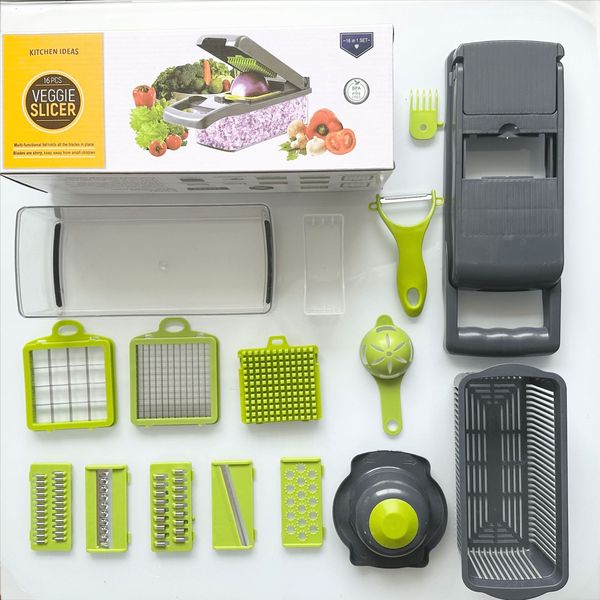 • 16 in 1 Multifunction Vegetable Cutter with Squre Basket – Portable Chopper, Shredder & Grater for Quick Meal Prep