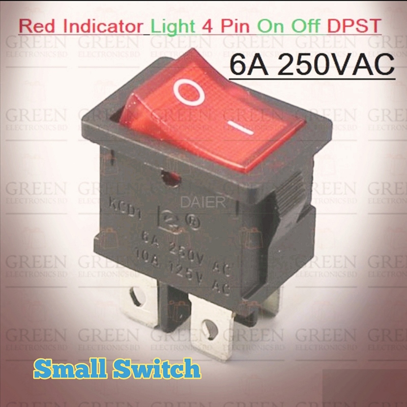 1pc Small Red Indicator Light 4 Pin On Off DPST Rocker Switch 2 Positions 6A/250VAC 10A/125VAC