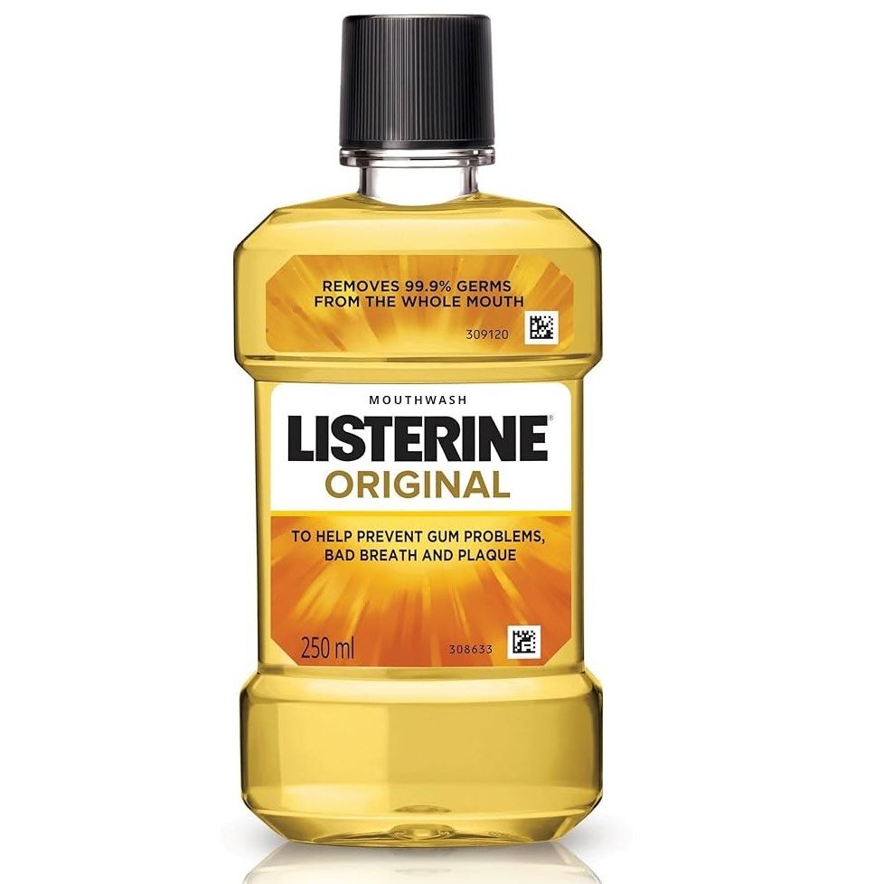 The image shows an original LISTERINE mouthwash label, highlighting its effectiveness in combating germs that cause bad breath, plaque, and other oral health issues. LISTERINE is a well-known brand trusted for its antiseptic properties, providing a thorough clean that helps maintain fresh breath and reduce plaque buildup. The label emphasizes its germ-fighting capabilities, positioning it as a reliable solution for everyday oral hygiene. The bold branding and clear messaging make it easily recognizable to consumers seeking a powerful mouthwash for their dental care routine.