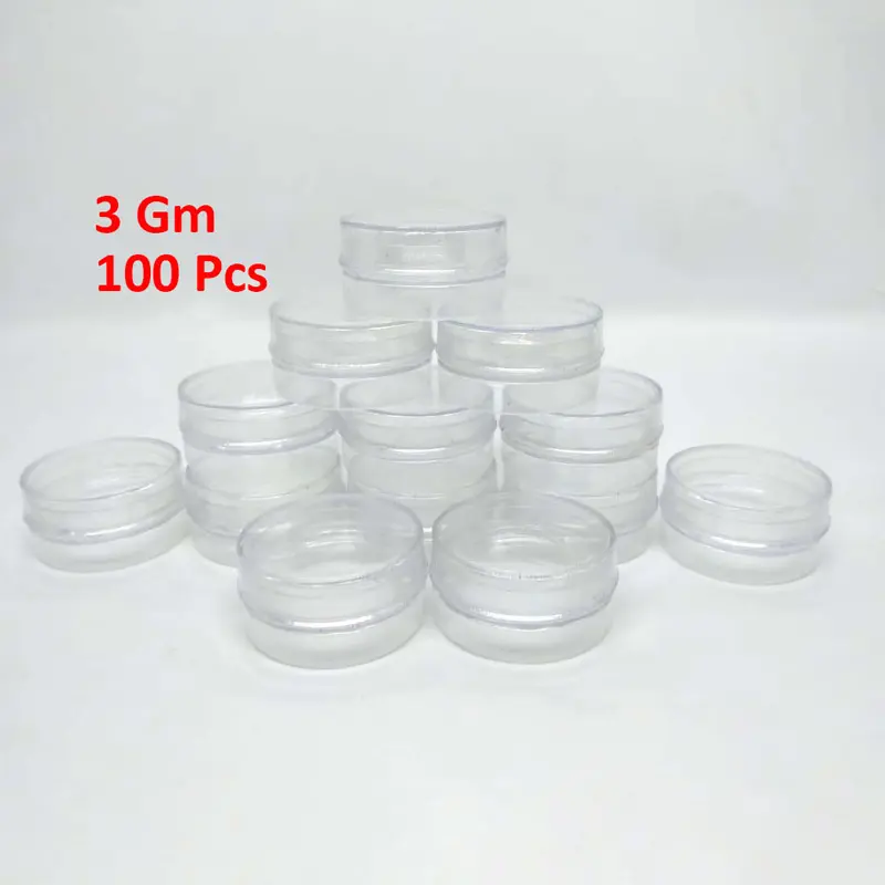The 3 Gm Mini Empty Jar 100 Pcs pack offers compact, high-quality plastic containers ideal for cosmetic sampling and storage. Each jar holds 3 grams (about 3ml) and comes with secure screw lids for leak-proof use