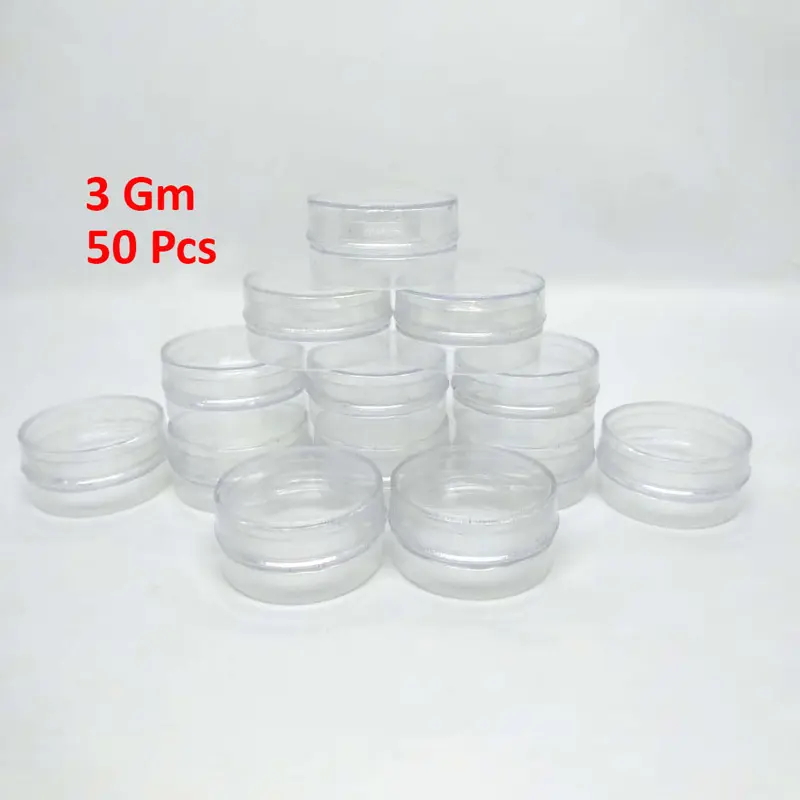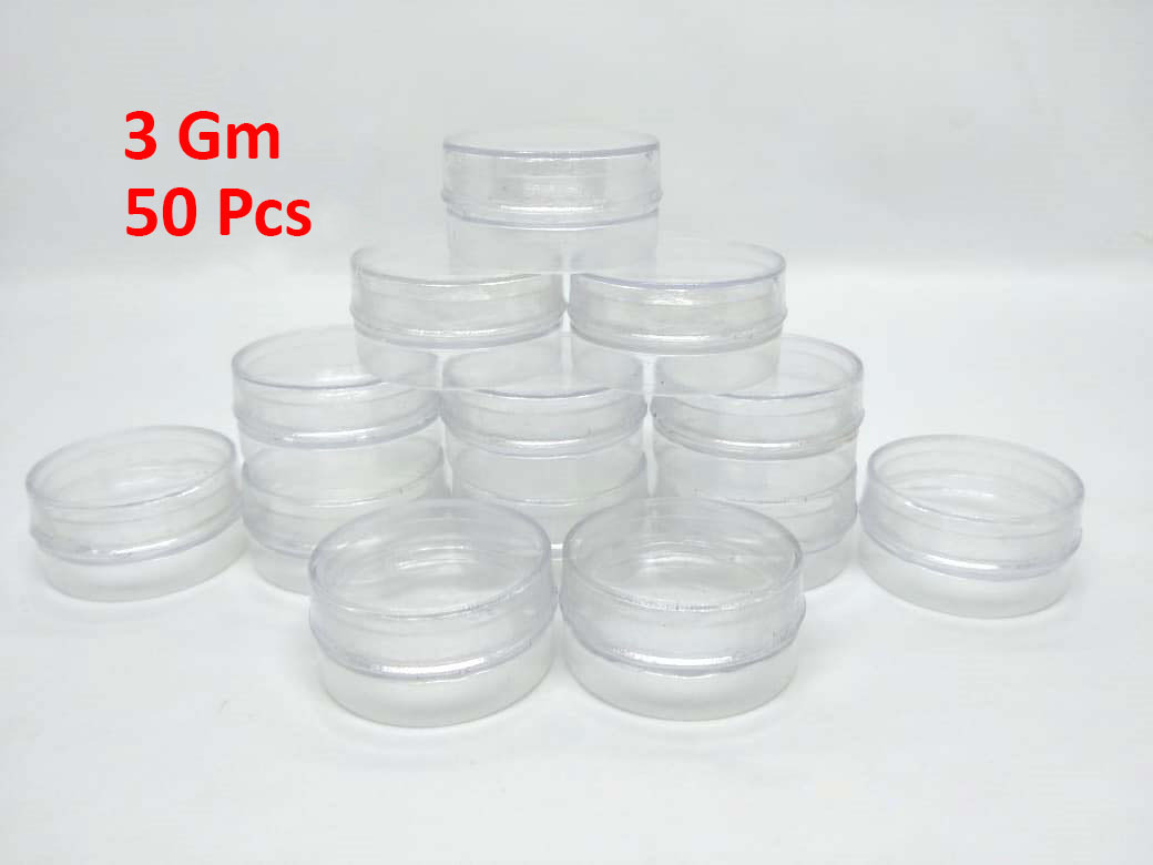 The 3 Gm Mini Empty Jar 50 Pcs pack offers compact, high-quality plastic containers ideal for cosmetic sampling and storage. Each jar holds 3 grams (about 3ml) and comes with secure screw lids for leak-proof use