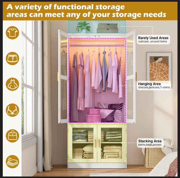 4-Door White 71" H Armoire With LED Sensor Light And Hanging Rod & 2 Door Shalve Storage Wardrobe, Modern White LED Sensor Light Almirah
