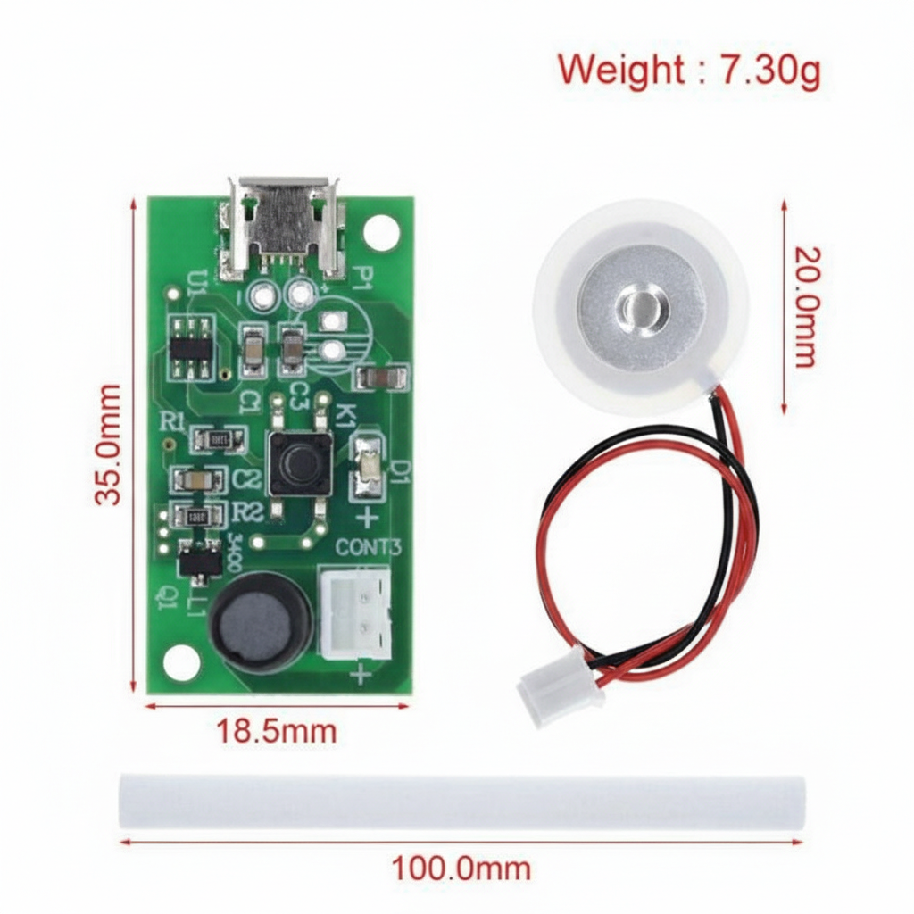 This kit includes a control circuit board, atomization films, and absorbent cotton cores, allowing users to build custom humidifiers, aroma diffusers, or fog effects for small enclosed spaces. Ideal for electronics hobbyists, students, and DIY innovators.