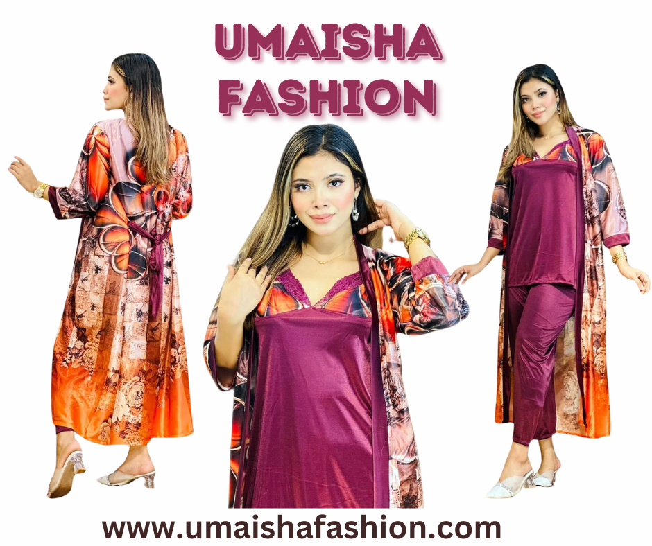 A stunning 3 part night dress with digital print on China Glaze fabric Nighty for woman.