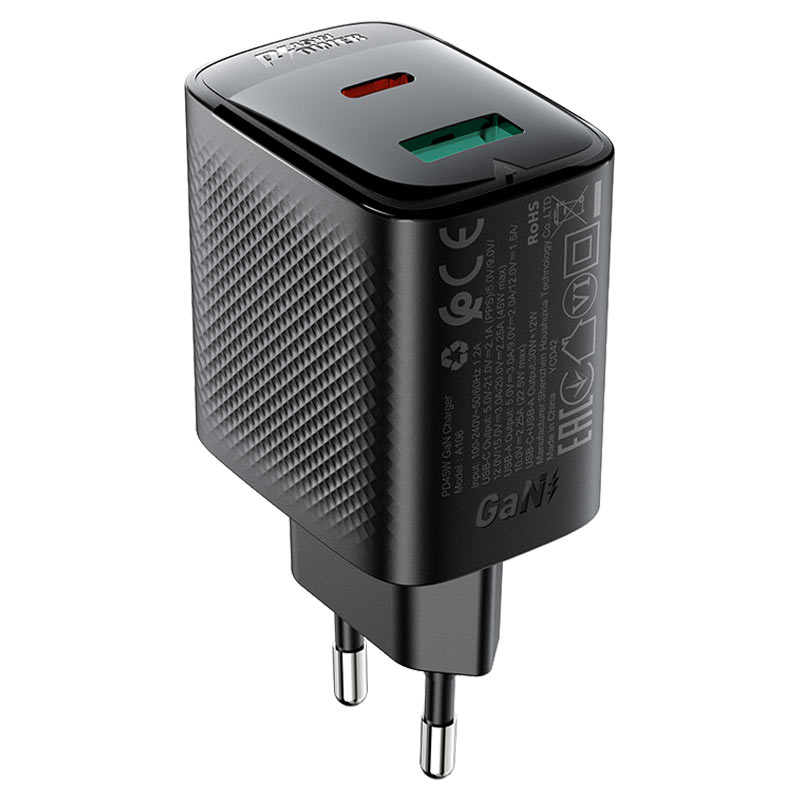 The ACEFAST A106 is a compact 45W GaN wall charger with dual ports to power your everyday gear. Use the USB-C port for PD/PPS up to 45W—ideal for fast-charging phones and many tablets—or the USB-A port for legacy devices up to 22.5W. When both ports are used, power is intelligently shared (30W + 12W). Built with a flame-retardant PC body and wide-range 100–240V input, it’s safe, travel-ready, and supports PD/QC/AFC/FCP/SCP protocols for broad compatibility. Perfect for home, office, and backpack carry.