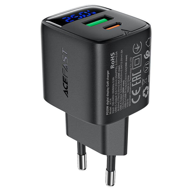 The ACEFAST A114 is a compact 25W GaN wall charger with dual ports for everyday fast charging. Use the USB-C port for up to 25W PD/PPS—ideal for modern Android phones and iPhone 15—or the USB-A port for legacy devices up to 20W. When both ports are used, it safely shares 15W total. The front LED digital display shows real-time charging status, while the flame-retardant PC shell and wide 100–240V input make it reliable at home, office, or travel. Broad protocol support (PD/QC/AFC/FCP/SCP) ensures wide device compatibility.