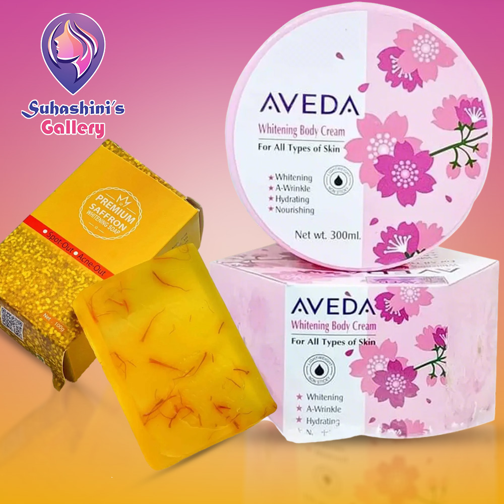 Aveda Whitening Body Cream + Premium Saffron Soap is a perfect skincare bundle designed to enhance your skin’s glow and hydration. The whitening body cream deeply nourishes and brightens the skin, helping to reduce dark spots and uneven tone. Enriched with saffron, the premium soap gently cleanses while providing essential nutrients for a radiant complexion. This combo works together to keep your skin soft, smooth, and naturally luminous. Suitable for all skin types.