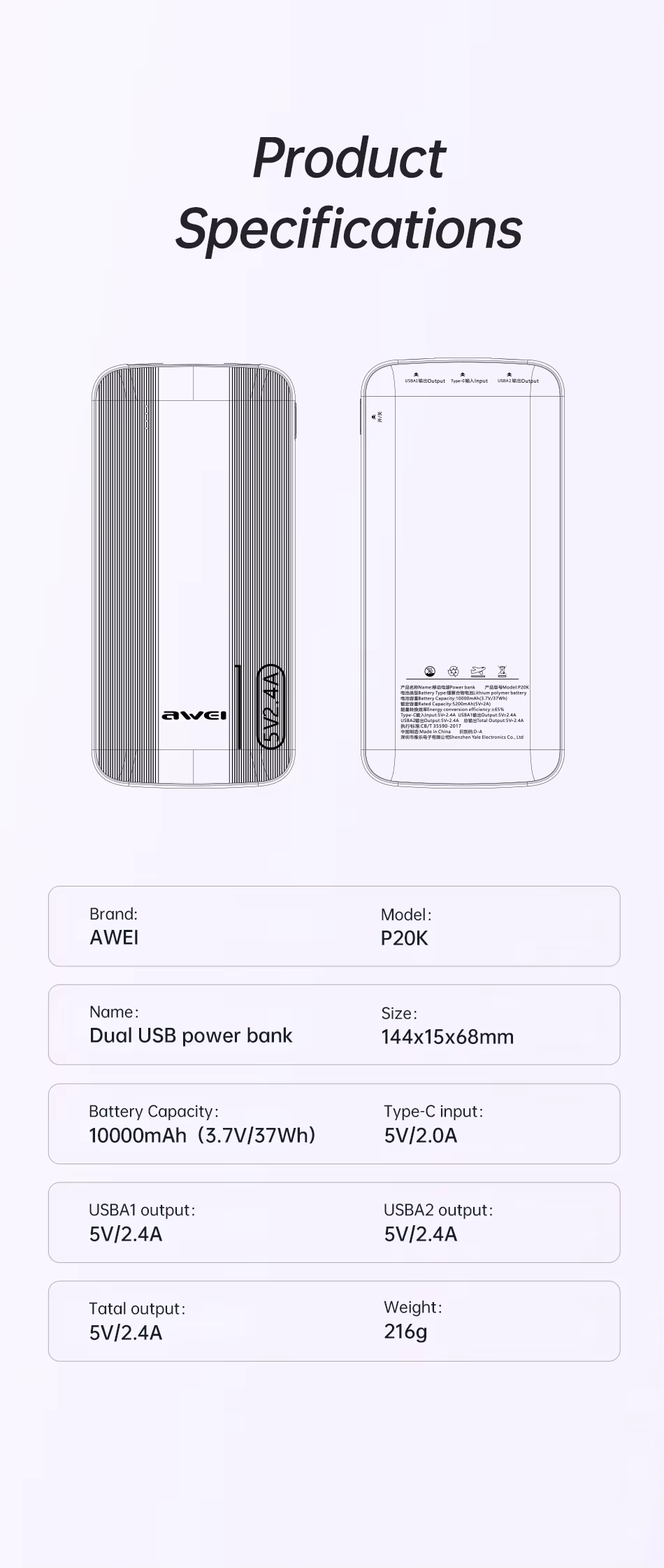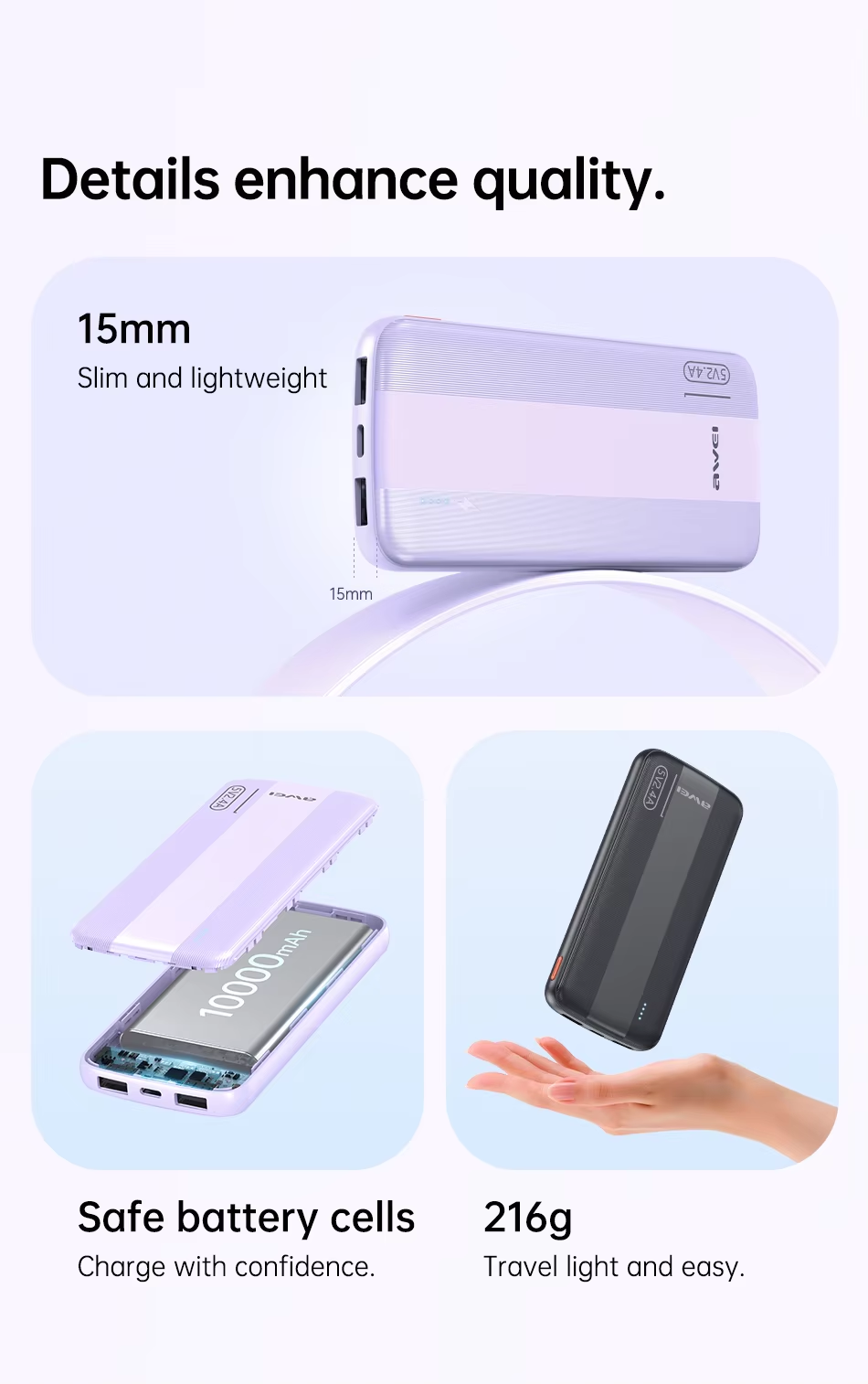 The Awei P20K Dual Output 2.4A Slim Power Bank isn’t some flimsy backup plan—it’s your insurance policy against dead batteries and lost opportunities. With 10,000mAh at your disposal, you’re not waiting around for an outlet. You’re calling the shots. Need to charge two devices at once? The dual 2.4A outputs ensure you’re back in the game, fast. No sluggish trickle charging, no excuses. Its slim, portable build slides into your pocket like a well-kept secret, always there when you need it. Durable, reliable, and ready to go, the Awei P20K isn’t just a power bank. It’s a guarantee that you stay ahead because falling behind is never an option.