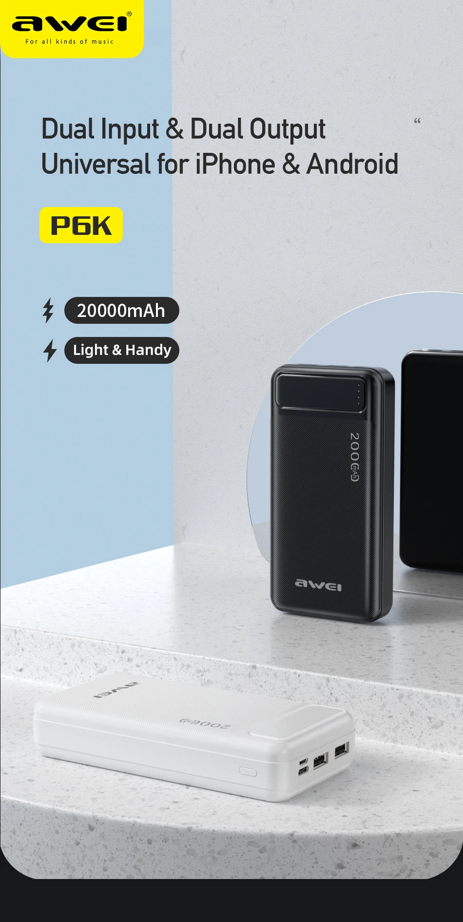 The Awei P6K is a straightforward, high-capacity 20000mAh power bank for everyday charging. It offers dual USB outputs (5V/2.1A shared) to top up two devices, and dual inputs—Type-C or Micro-USB (5V/2.1A)—so you can recharge the bank with whichever cable you have. A clear LED indicator shows remaining power at a glance. Built with a Li-polymer cell inside a compact body (136.5×69×28 mm, ~420 g), it’s a practical, budget-friendly backup for commuting, campus, travel, and emergency use in Bangladesh.