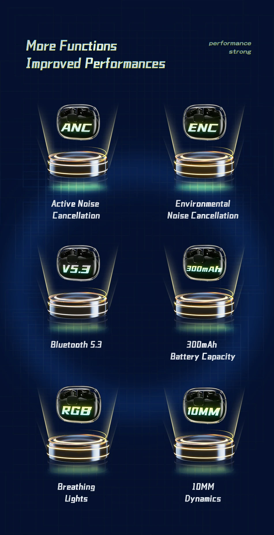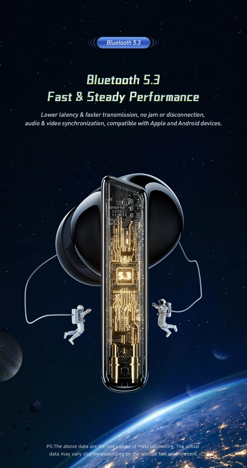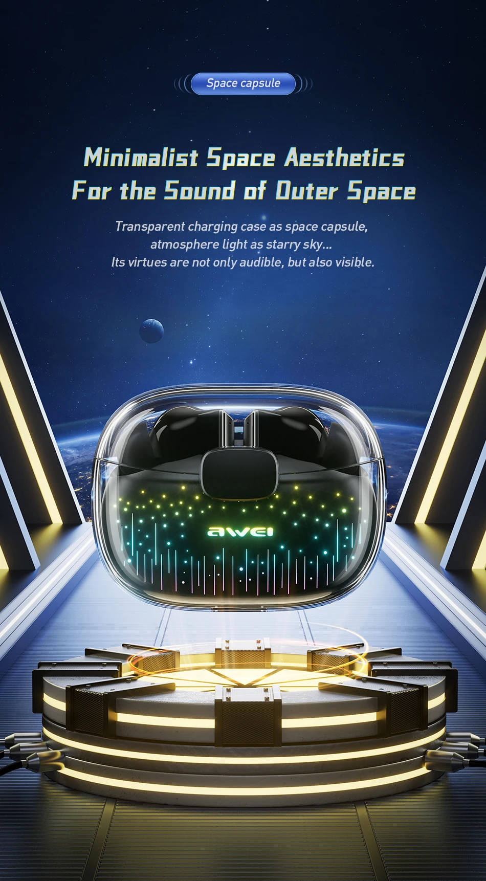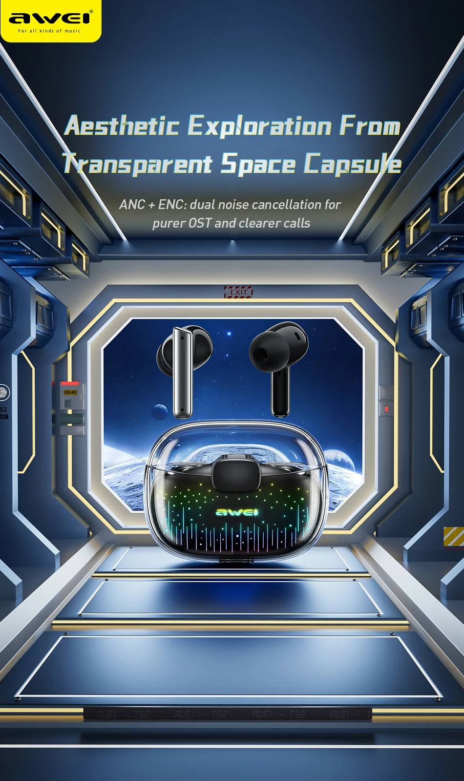 The Awei T52 ANC are everyday Bluetooth TWS earbuds that blend active noise cancellation (ANC) with clear call ENC and a fun, gamer-friendly look. The 10 mm driver delivers lively sound, while Bluetooth 5.3 keeps connections stable for music, videos, and calls. Expect about 6 hours per charge (listings note up to ~8 h), with the 300 mAh case adding multiple top-ups. A low-latency mode improves sync for games and videos, RGB breathing lights add style, and IPX6 helps against sweat and rain. Charge via USB-C and you’re set for commute, campus, or content creation on Android or iPhone.