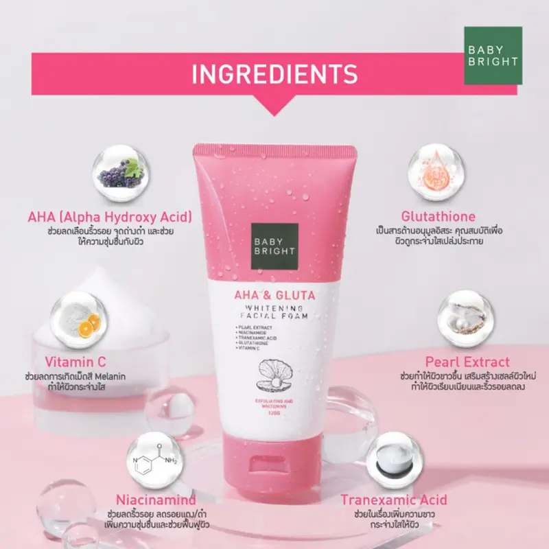 • AHA & Gluta Whitening Facial Foam 120g Baby Bright• AHA & Gluta Whitening Facial Foam by Baby Bright• • Ultimate facial cleanser with luscious, dense foam• • AHA, glutathione, and vitamin B3 neutralize free radicals• • Oil-control cleanser boosts moisture and radiance• • Ethyl Ascorbic Acid reduces melanin production• • Tranexamic Acid and pearl extract promote skin cell regeneration