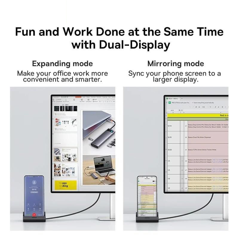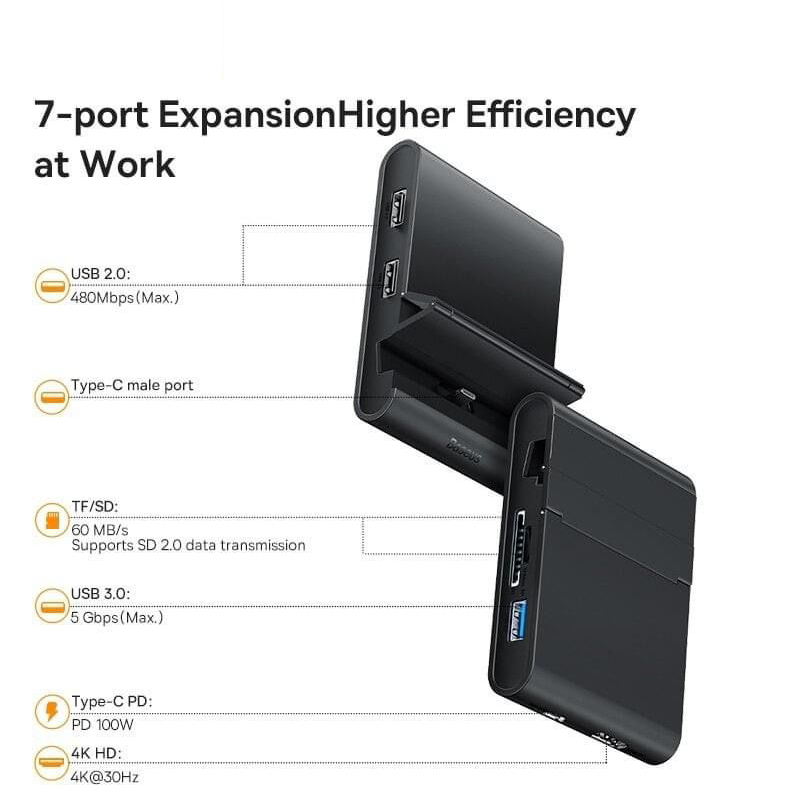 - 7-port expansion, high work efficiency Simultaneous expansion of 7 ports.a laptop is turned into a desktop in a second, high efficiency for business trips and office work.