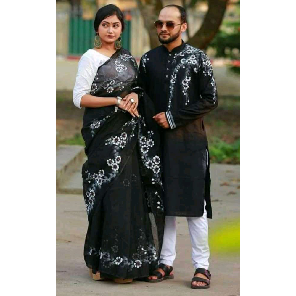 Black Hand Print Half Silk Saree and Dupaiyan Panjabi couple Dress for Men and women