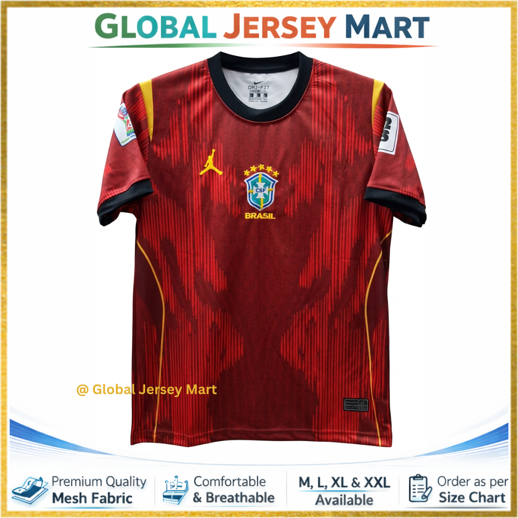 Support Brasil in a bold, modern look with the Nike Brazil (CBF) Away Jersey 2024/25 featuring Jordan Jumpman branding and performance-ready comfort. This short sleeve jersey comes in a striking maroon/red base with dynamic tonal wave graphics, finished with clean black collar & cuffs and sharp yellow/gold accents for a premium match-day vibe.