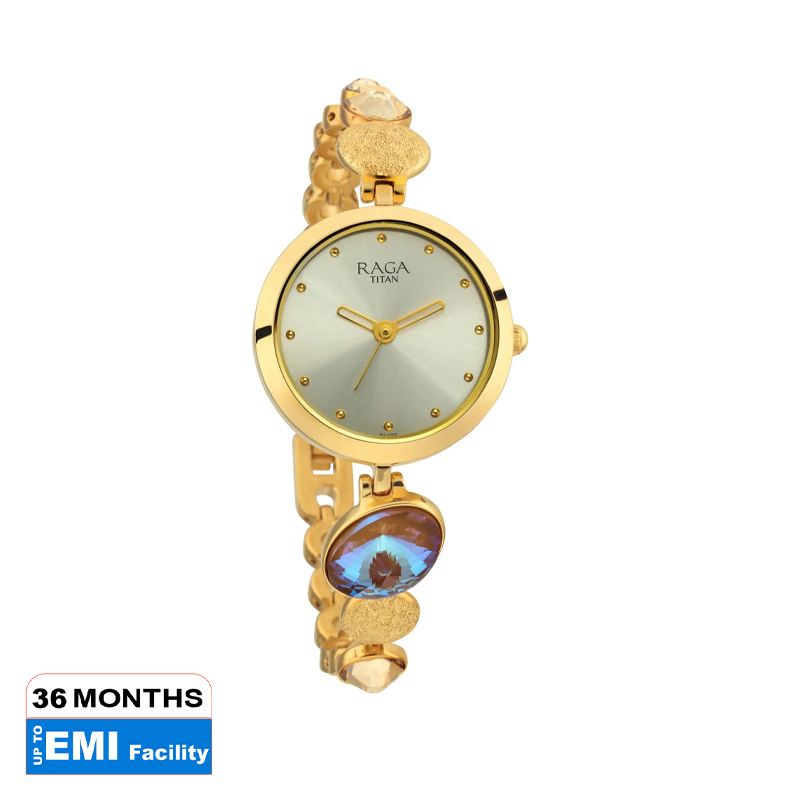 Titan Raga Moments of Joy for Ladies with Golden Metal Strap , Mineral Glass Glass , Champagne Dial Colour , Round Plain 3 Hands Quartz Case , Case Size: 28 mm Width 34 mm Length 7 mm Thickness with Jewellery Lock , Water Resistance : 3 ATM