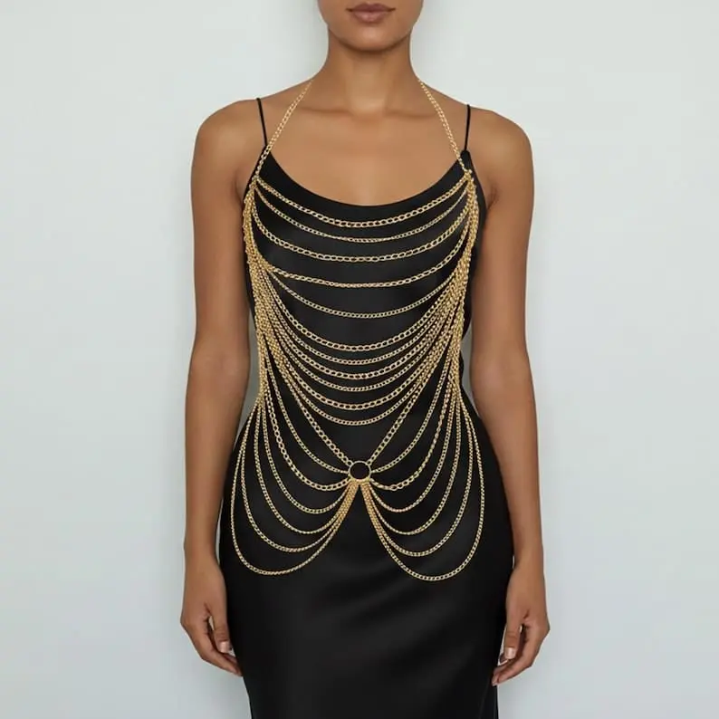 • Features a bikini chest chain and waist chain.