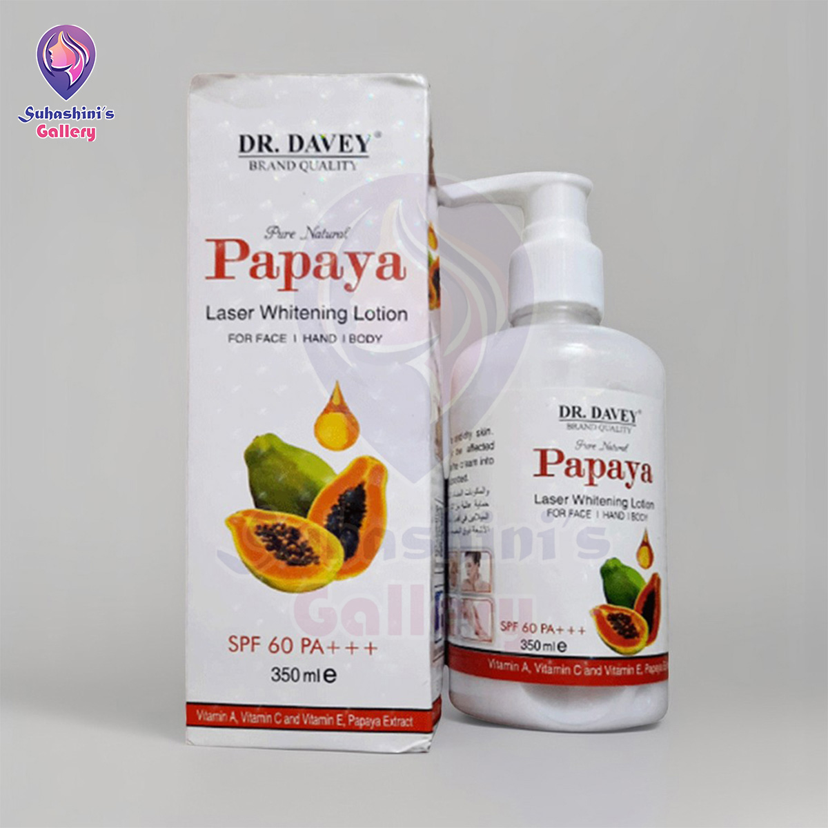 The Dr. Davey Papaya Body Lotion is a premium skincare solution that combines the nourishing properties of papaya extract with advanced sun protection. With SPF 60 PA+++, this lotion shields your skin from harmful UVA and UVB rays, preventing sun damage, dark spots, and premature aging. Enriched with natural papaya enzymes and antioxidants, it brightens and moisturizes your skin, leaving it soft, smooth, and glowing. Ideal for daily use, this body lotion ensures your skin stays hydrated and protected throughout the day.