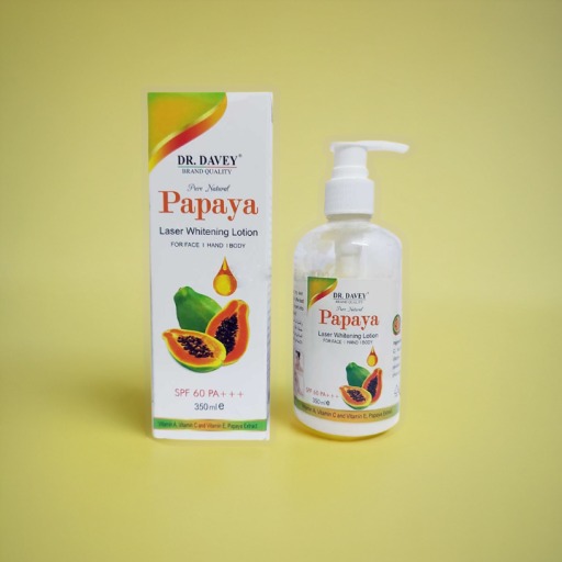 Dr. Davey Pure Natural Papaya Body Laser Whitening Lotion is a luxurious skincare product designed to lighten, moisturize, and rejuvenate your skin. Infused with natural papaya extracts, it helps reduce the appearance of dark spots, blemishes, and uneven skin tone. The lotion’s rich formula deeply penetrates the skin, providing essential nutrients and hydration. Its unique laser whitening technology works to brighten your skin, leaving it smooth, radiant, and glowing. Suitable for all skin types, this lotion is perfect for daily use to achieve a flawless complexion.