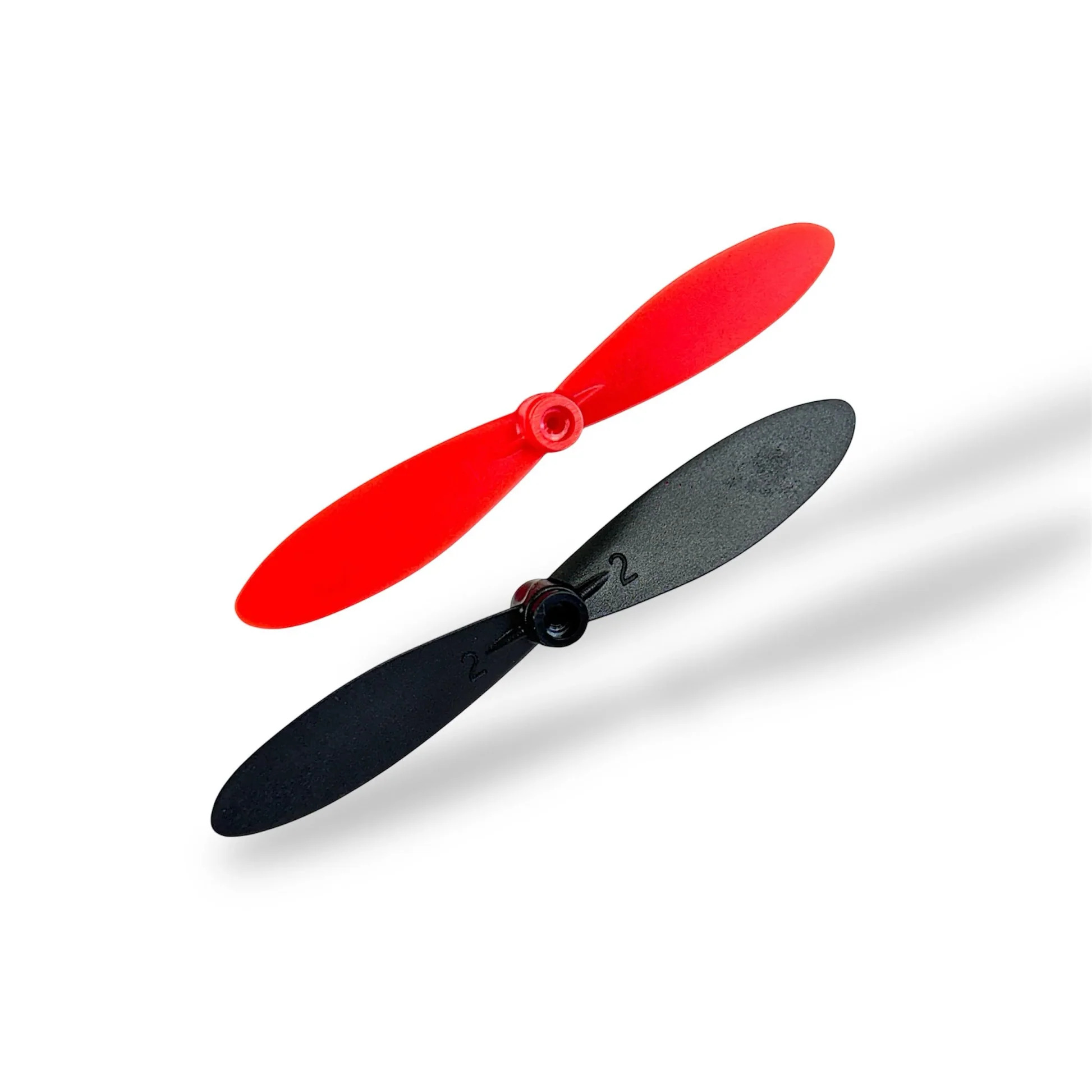 This 2-piece mini propeller set includes one red and one black two-blade propeller, each measuring approximately 55 mm in length, designed for coreless drone motors with 0.9 mm to 1.0 mm shaft diameter. Made from durable, lightweight plastic, these propellers are ideal for micro drones, DIY quadcopters, and other lightweight flying robots. The color-coded pair allows for easy identification of clockwise (CW) and counterclockwise (CCW) rotation during installation and flight calibration.