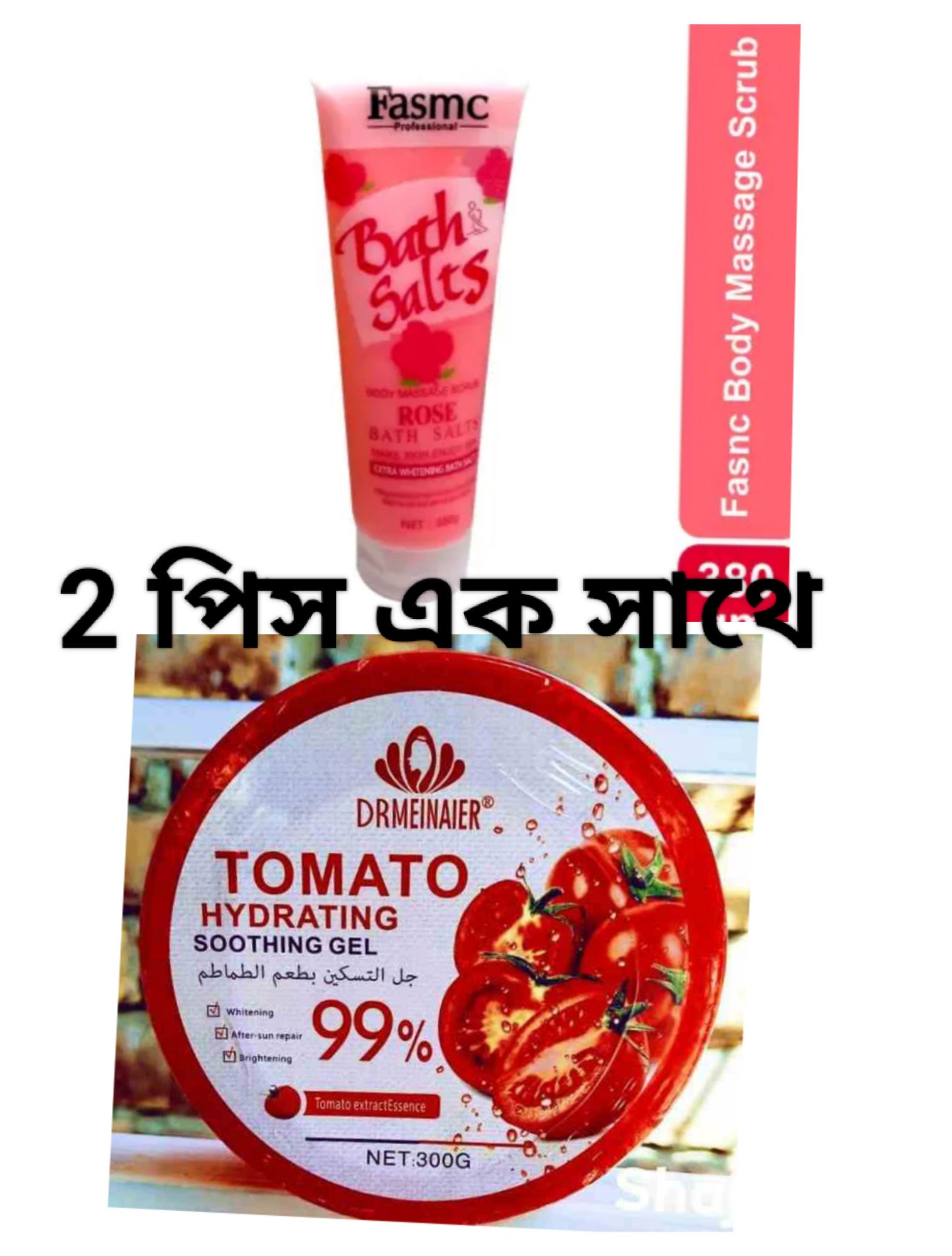 FASMC Rose Bath Salts Body Massage Scrub এবং Tomato Hydrating Soothing Gel হল একটি চমৎকার স্কিনকেয়ার কম্বো যা মসৃণ, উজ্জ্বল এবং হাইড্রেটেড ত্বক নিশ্চিত করে। এই কম্বো ত্বককে মৃদুভাবে এক্সফোলিয়েট, উজ্জ্বল এবং হাইড্রেট করে, যা ত্বককে সতেজ ও দীপ্তিময় করে তোলে। পুরুষ এবং মহিলাদের জন্য আদর্শ, এই সেট শরীর ও মুখের সম্পূর্ণ যত্নের জন্য উপযুক্ত।
