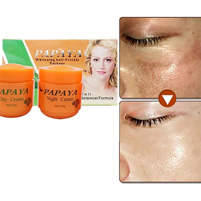 The FEIQUE Papaya Whitening Anti-Freckle Day and Night Cream Set is a skincare duo designed to brighten the skin, reduce freckles, and promote an even skin tone. Infused with natural papaya extracts, these creams work together to nourish and moisturize your skin while targeting dark spots and pigmentation. The day cream provides sun protection and hydration, while the night cream works overnight to rejuvenate the skin, leaving it soft, radiant, and even-toned.