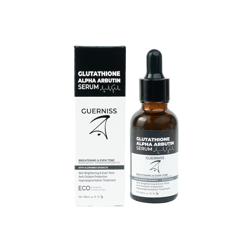 - Guerniss Raw Glutathione Alpha Arbutin Serum is a powerful brightening formula designed to target dark spots, pigmentation, and uneven skin tone while keeping your skin hydrated and healthy. This lightweight, fast-absorbing serum blends science-backed ingredients with gentle skincare technology to deliver visible results without irritation.