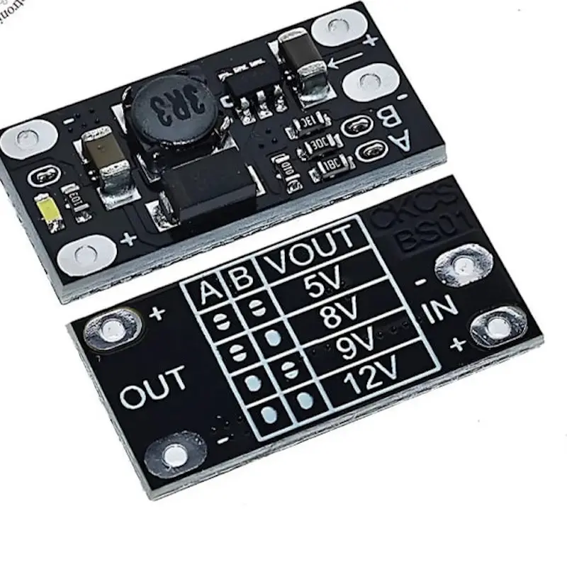 - Input voltage range: 2.5V~5VOUT. The input voltage must be lower than the set output voltage.Output capability: When inputting 3.7V lithium battery, it can output 5V1A, 8V0.5A, 9V0.45A, 12V0.3A;When inputting at 5V, it can output 8V0.7A, 9V0.7A, 12V0.5A.When the default 12V output, the LED indicator consumes about 1mA.If the indicator is turned off, the input current is <1mA at no load.Voltage setting description:The front side of the PCB can be seen with the words A and B. Use the soldering iron to change the pad pass next to the character.The output voltage can be changed by breaking. In the following table, 0 indicates that the pad is disconnected, and 1 indicates that the pad is connected.