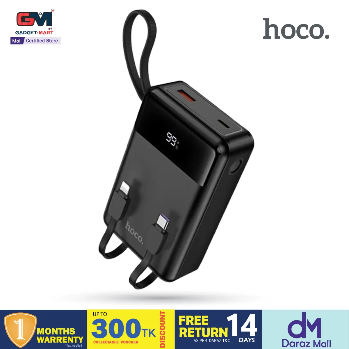 Hoco MMJ-17 Fully Compatible 22.5W Fast Charging 20000mAh Powerbank with Digital Display & 2 Built in Cable (Type-C & lightning) - Black - Black