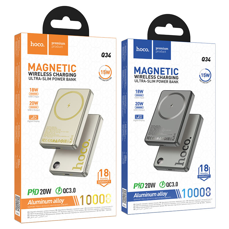 The HOCO Q34 Clever is a compact 10,000mAh power bank that combines 20W USB-C PD fast charging with up to 15W magnetic wireless charging. Snap it on for cable-free top-ups, or plug in via USB-C for the fastest speed. A clear LED display shows remaining power and a green indicator confirms PD/QC fast-charge status. Built with an aluminum-alloy + ABS/PC flame-retardant shell and Li-polymer cells, it’s a durable, travel-friendly choice for Android and iPhone users in Bangladesh.