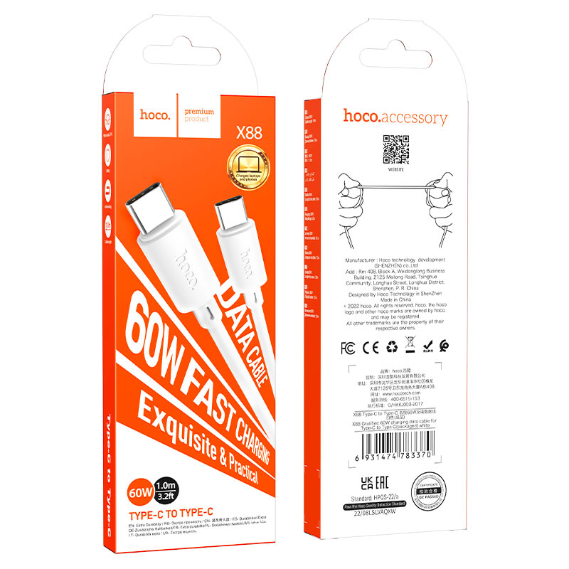The Hoco X88 Type‑C to Type‑C Cable is purpose-built for today’s high-speed charging and data demands. At 1 meter length and ~24 g, it’s exceptionally portable. Rated for PD 60 W (20 V/3 A), it can power laptops, tablets, and 3 A fast-charge compatible smartphones. Crafted with a durable PVC sheath and robust housing, its 3.5 mm thick, multi-core copper wiring ensures efficient and stable performance.