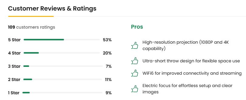 One user praised its performance, especially for short throw: “I'm impressed! … picture is sharp and big for a short throw … auto focus works well,” though they noted to avoid full sun lighting