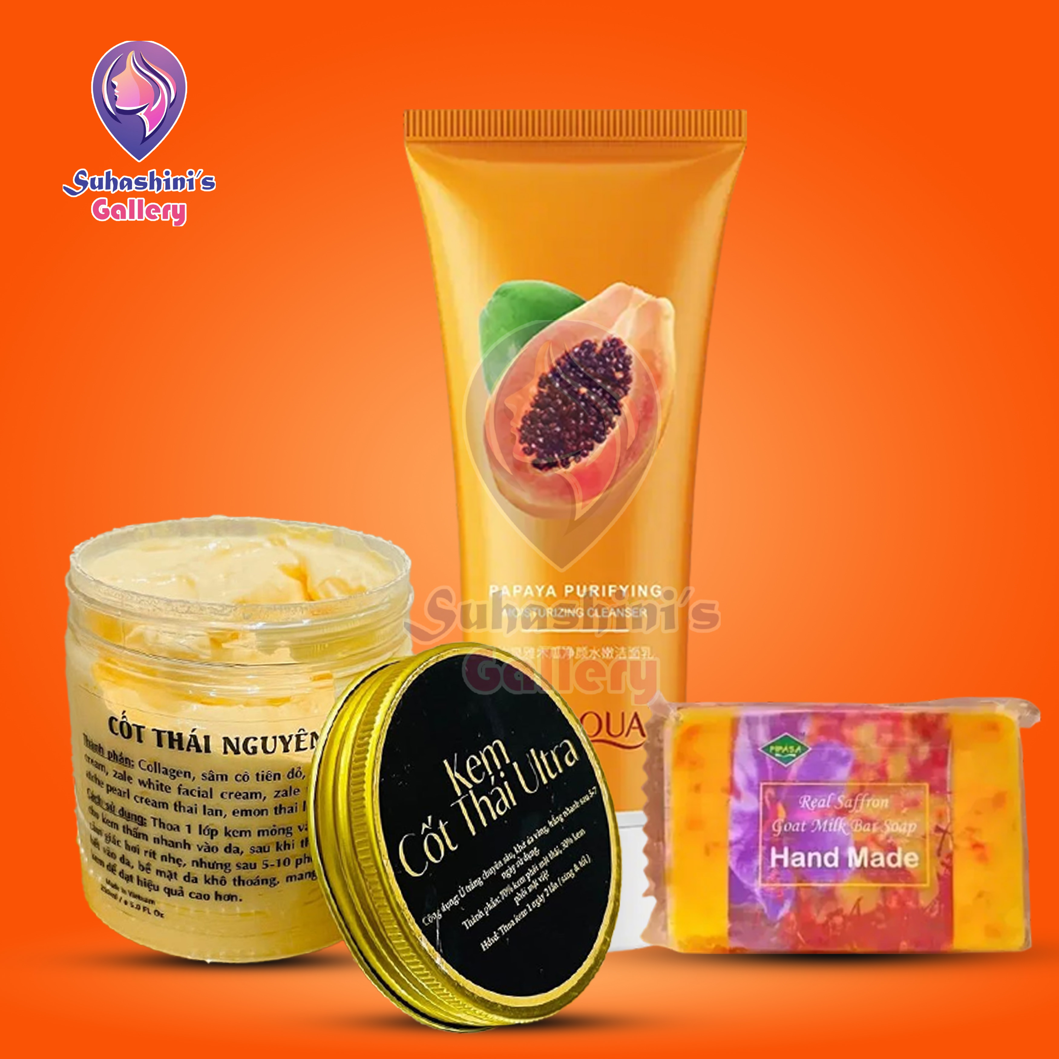 Kem Cot Thai Skin Glowing Combo একটি সম্পূর্ণ স্কিনকেয়ার সেট, যা আপনার ত্বকের প্রাকৃতিক উজ্জ্বলতা বাড়াতে সহায়তা করে। এতে রয়েছে: