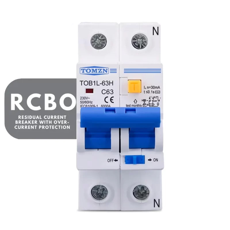 - The TOMZN TOB1L-63H RCBO is a 2-pole (2P) residual current circuit breaker with over-current protection (MCB function) and leakage protection (RCD function). It’s designed to protect both line (L) and neutral (N) wires in residential and industrial electrical installations.