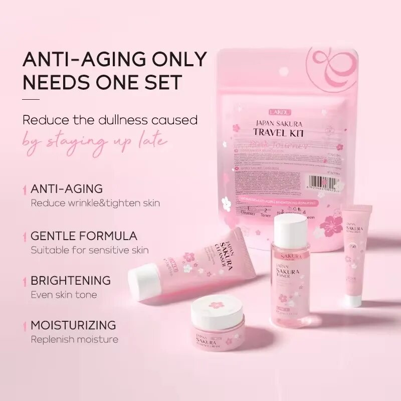 Introducing the Laikou Japan Sakura Travel Kit 4 in 1 set, brought to you by LAIKOU. This kit is perfect for those who are always on the go and want to maintain their skincare routine. The kit includes four essential products that will leave your skin feeling refreshed and rejuvenated. The product form is versatile and easy to use. The kit is part of the Health & Beauty category, specifically under Skin Care and Facial Cleansers. The Laikou Japan Sakura Travel Kit 4 in 1 set is a must-have for anyone who wants to keep their skin looking its best, no matter where they are.