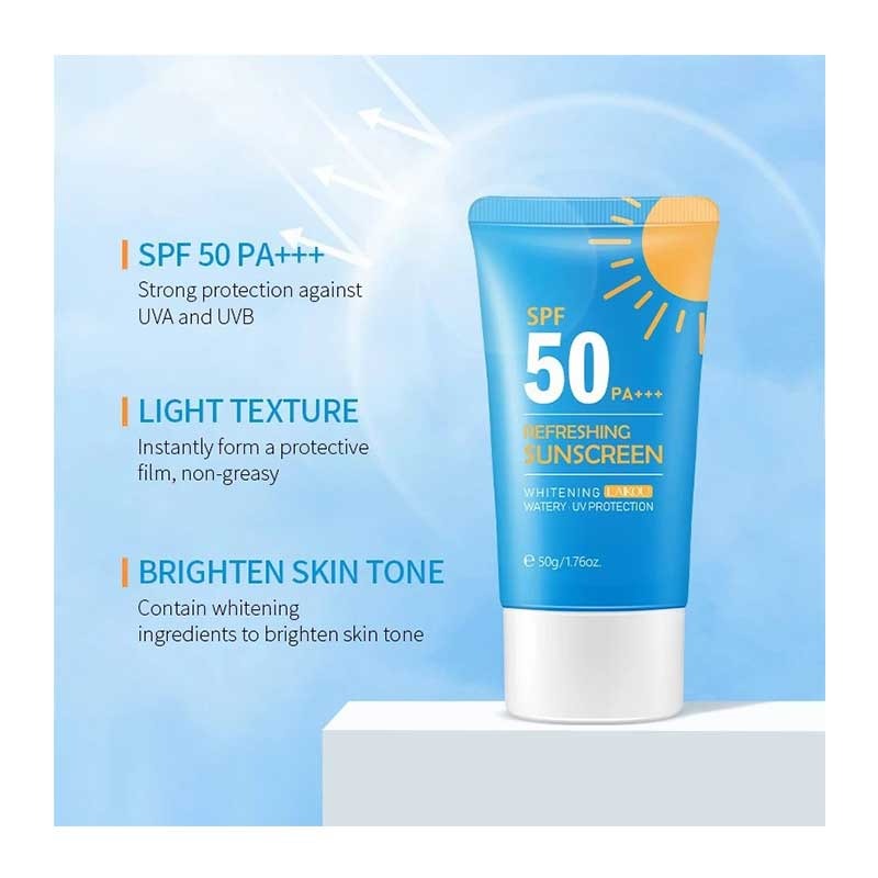 Product type: Sunscreen cream Brand: LAIKOU Net Weight: 50g Use benefits; Refreshing, UV Protection & Moisture Use: Face & Body Imported From: China