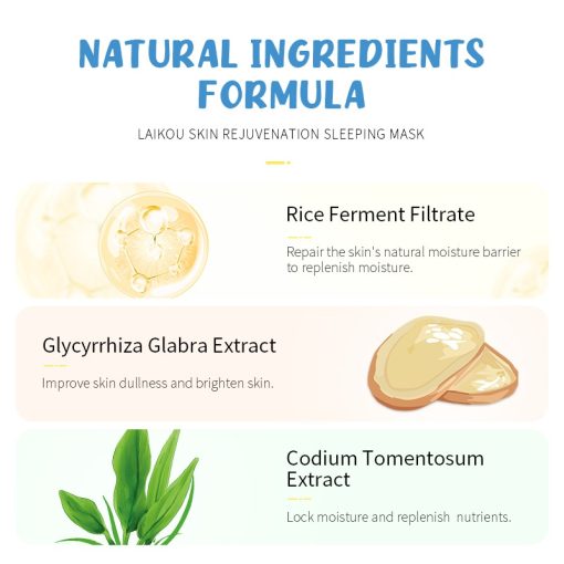 *1. Rich in various natural extracts that can help to repair skin barriers, sooth skin and brighten skin tone. *2. Light and clear texture, easy to apply, smooth and soften skin with long term use. *3. Formulate with natural moisturizing extracts to keep skin lasting moisture, improve dry and rough skin. *4. Help to repair damaged skin after sunburned, brighten skin and keep skin vitality. *5. It can be used during the sleeping time, and wash with warm water the second day.
