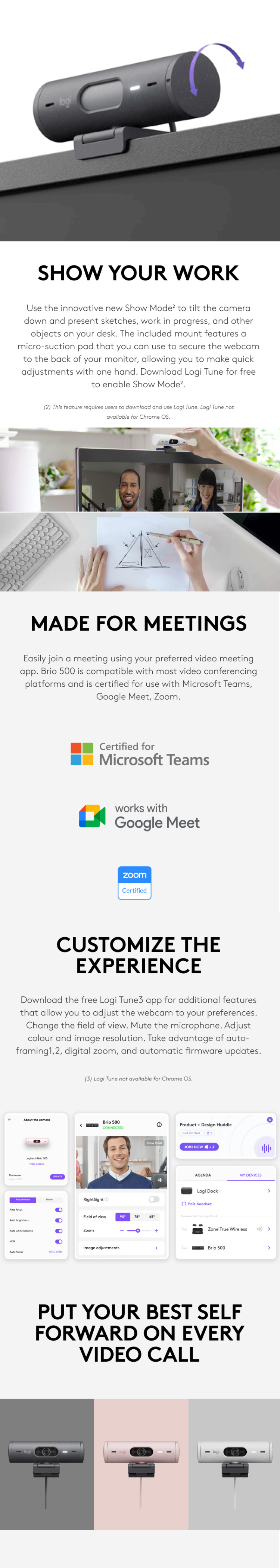 Show up to every video call feeling confident, seen, and heard. Logitech Brio 500 includes features like auto light correction for low-lighting conditions, auto-framing(1)(3) so you can move during calls, and Show Mode for presenting objects on your desk. Brio 500 Webcam creates a more authentic Google, Teams, or Zoom meeting experience, allowing you to be your best self on every video call.