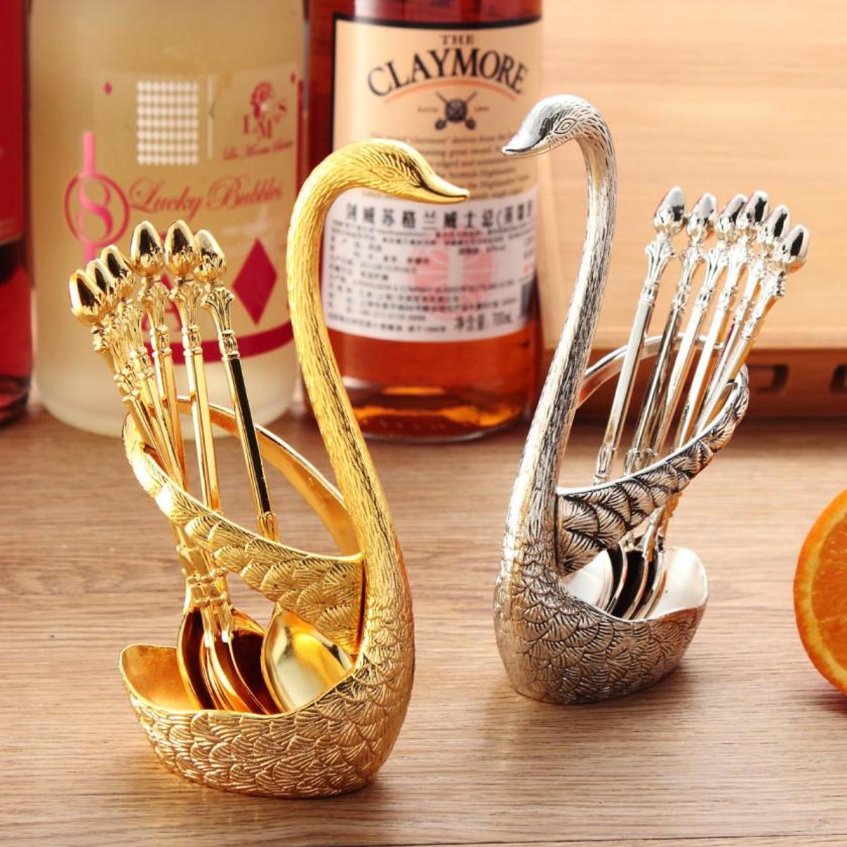 6 Pcs Spoon Set with 1 Pcs Swan Stand – Golden or Silver