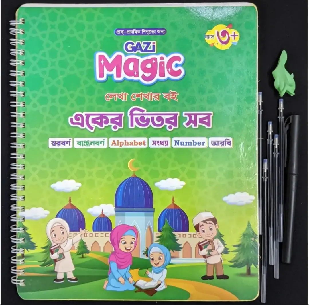 This Magic Handwriting practice and learning book with Arabic all in one is the perfect tool for children to learn and practice their handwriting skills. With its comprehensive approach, this notebook covers all aspects of Arabic writing, including letters, words, and sentences. The notebook is designed to help children develop their writing skills in a fun and engaging way. The notebook is perfect for children who are just starting to learn Arabic writing or for those who want to improve their skills. This notebook is a great addition to any child's learning and education collection.