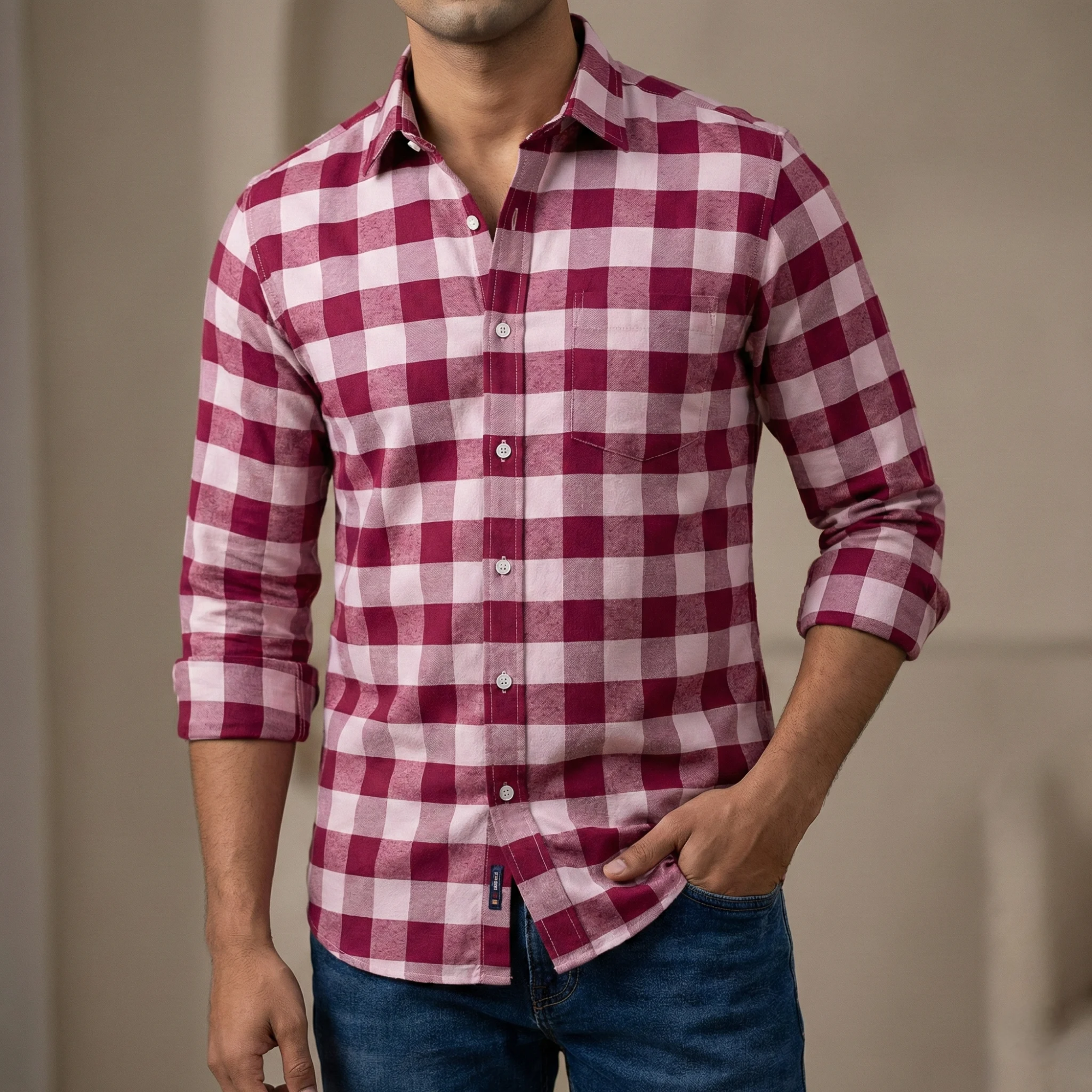 Men's long sleeve check shirtFabric: cottonType: stander folding Size measurement :SizeChestLengthM4028L4229XL4430XXL4631