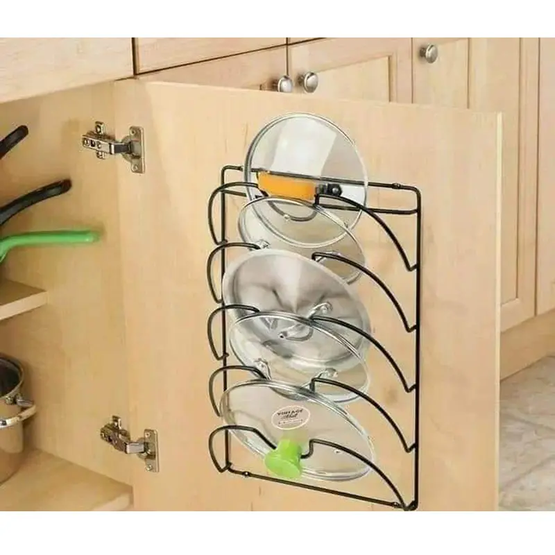 This Metal Lid Holder is a versatile kitchen organizer designed to keep your pot lids, pans, dishes, cookie sheets, bakeware, and cutting boards neatly arranged. The U-shaped central depression ensures a stable hold for pot lids and plates, preventing shaking and instability. Made from durable metal, it can be used on countertops or in the sink, helping to save valuable space in your kitchen. Ideal for keeping your kitchen tidy and organized, this holder is both functional and space-saving.