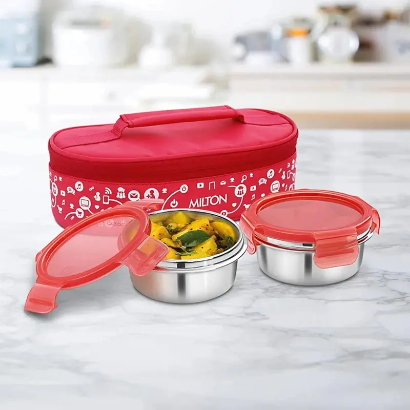 Upgrade your lunchtime experience with the Milton Lifestyle Lunch Box, designed for convenience and durability. This vibrant set includes two stainless steel containers (300 ml each), perfect for portion-controlled meals that stay appetizing throughout the day. Each container features a leak-proof, 4-sided locking lid to prevent spills and keep food fresh.