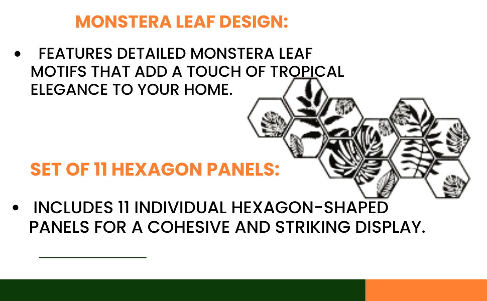 Enhance your home with this stunning Monstera Hexagon Wall Art set. Featuring 11 intricately designed hexagon panels, this modern tropical plant decor brings the beauty of the outdoors inside. Each panel showcases a detailed monstera leaf motif, creating a cohesive and visually striking display perfect for any room in your home.