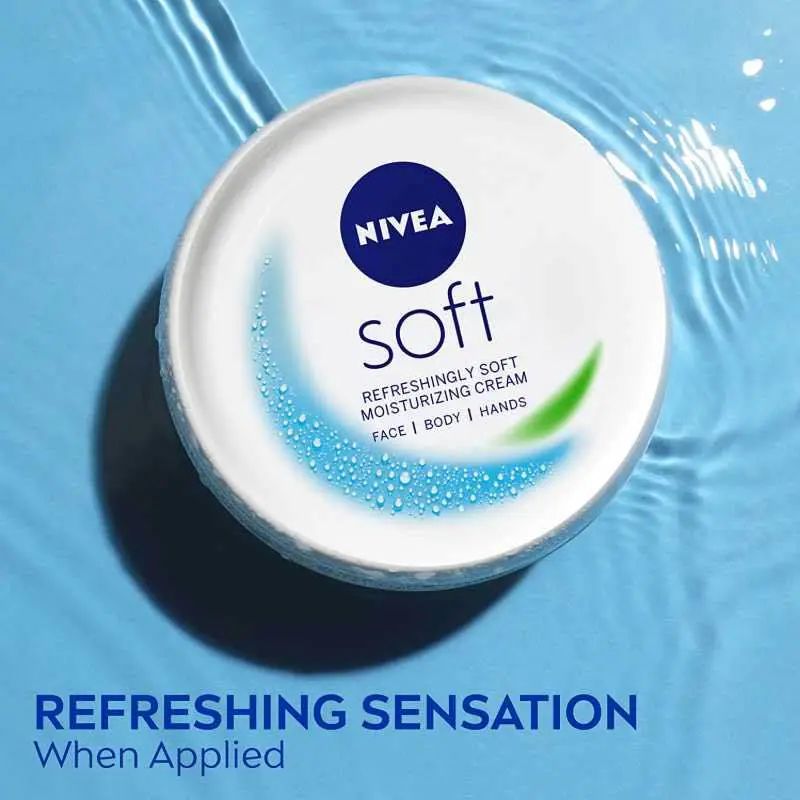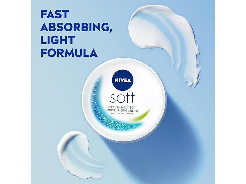 Nivea Soft Moisturising Cream with Jojoba Oil and Vitamin E offers refreshingly soft moisturising for face, body and hands. NIVEA Soft Intensive Moisturising Creme is ph neutral and dermatological approved. How It Works Use NIVEA Soft on face, hands and body. Get rich moisture care with Jojoba Oil and Vitamin E Sense the fast absorbing cream Feel and see how your skin gets sensationally soft and smooth.