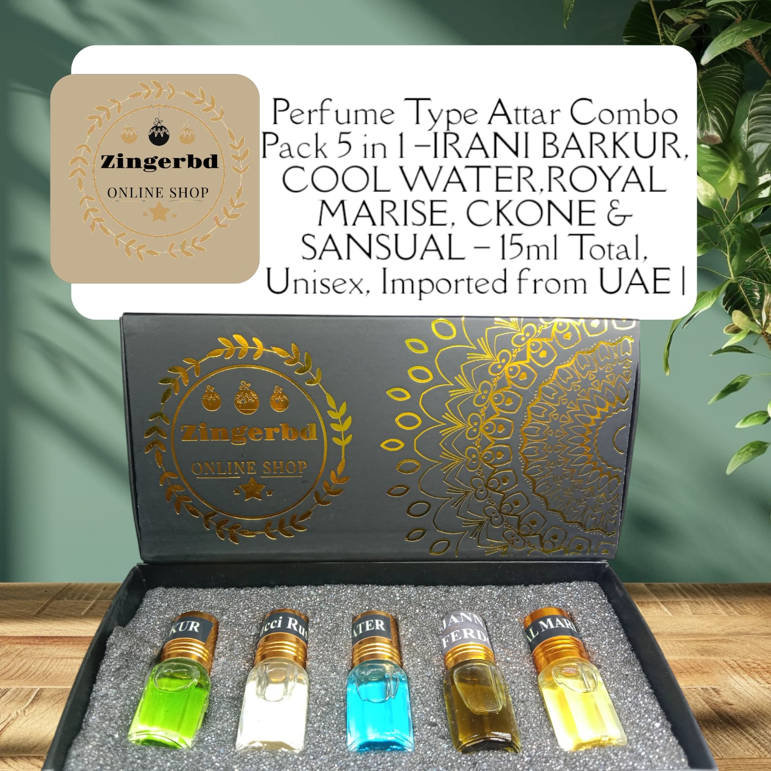 Perfume Type Attar Combo Pack 5 in 1 – IRANI BARKUR,COOL WATER,CKONE ,ROYAL MARISE,SANSUAL– 15ml Total, Unisex, Imported Ator Perfume from UAE