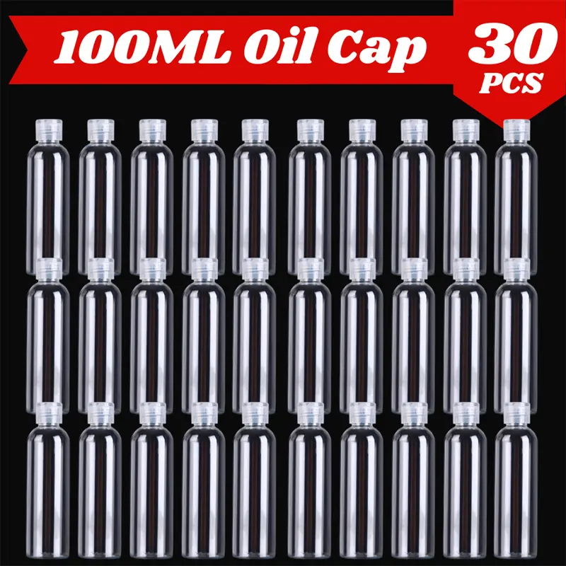 Plastic Oil Bottle Tiptop Cap 100Ml Transparent- 30 pcs is a set of clear, refillable PET plastic bottles designed for safely storing and dispensing various oils and liquid products. Each bottle has a 100 ml capacity and comes with a secure flip (tiptop) cap that helps prevent leakage and makes pouring or applying oil easy and controlled.