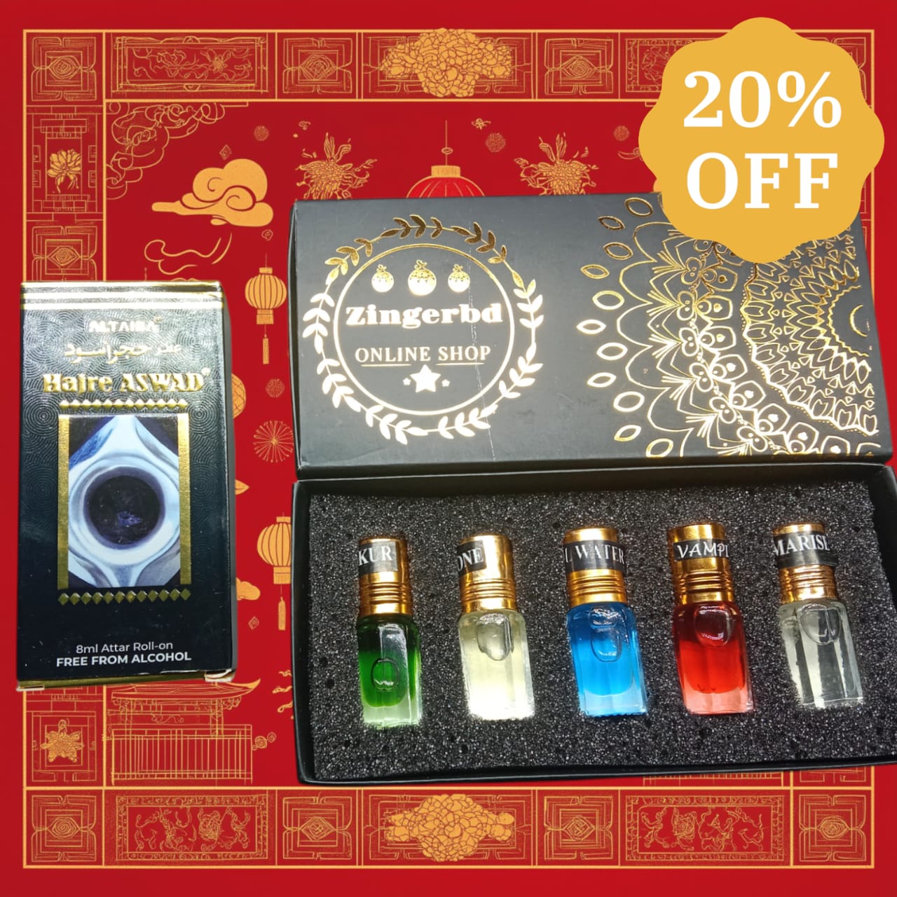 Specifications: Concentrated Perfume Oil,Capacity: 15ml (COOLWater 3ml, ITANI BARKUR 3ml, ROYAL MARISE 3ml, CKONE 3ml & SENSUAL 3ml)Natural fragrance,Free from Alcohol,Long lasting perfume,With beautiful box,