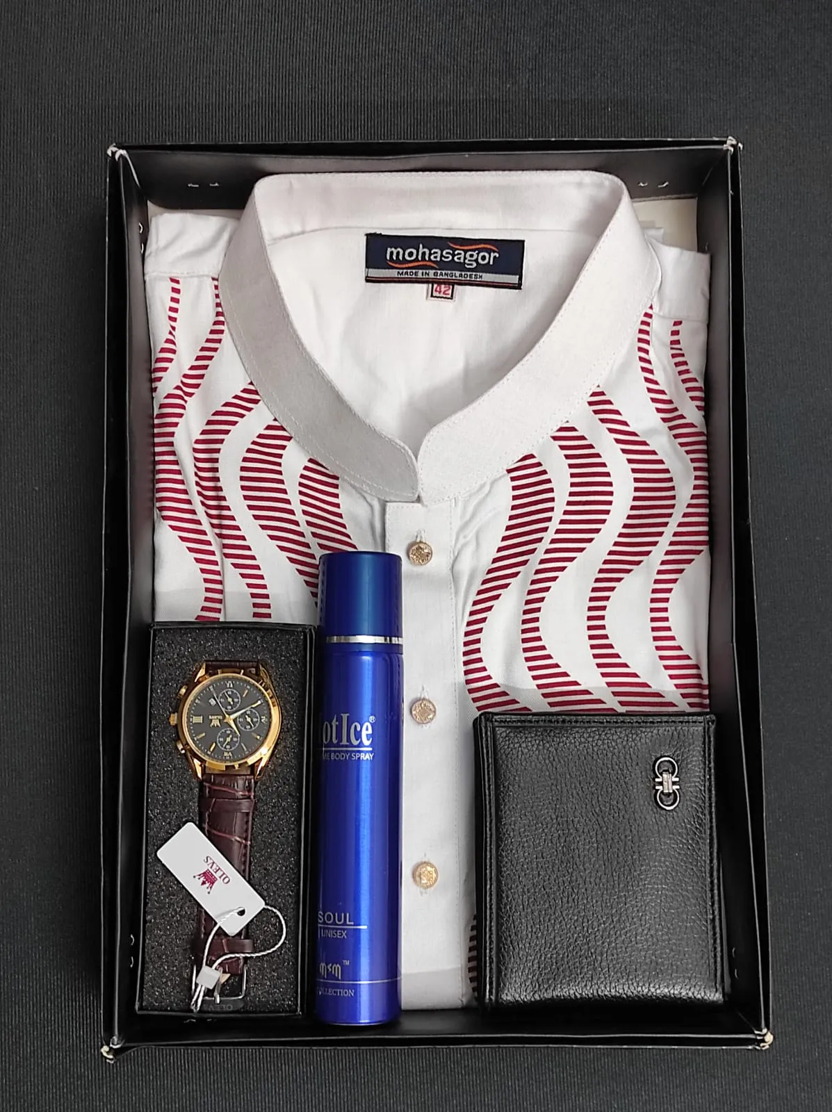 Panjabi Details: Brand: Mohasagor100% Original Cotton Imported Fabrics.Handcuff Style on Hand.Premium Show Button.Quality Controlled (QC) Finishing.Very Own Unique Design.Measurement:40 = Length 40″, Chest 42″42 = Length 42″, Chest 44″44 = Length 44″, Chest 46″Perfume Details:Brand: Hot iceItem form: SprayBrand: HOT ICEItem form: Spray100 MLWatch Details:Artificial Leather Chronograph Wrist Watch For Men (Master Copy)Band Length: 20cmMovement: QUARTZClasp Type: Hook BuckleOrigin: CN(Origin)Case Material: AlloyCase Thickness: 11.5mmDial Window Material Type: CoatedGlass Item Type: Quartz WristwatchesBand Material Type: LeatherDial Diameter: 40mmModel Number: 2872Band Width: 11mmCase Shape: RoundFeature: Back LightFeature: Shock ResistantFeature: Luminous Wallet Details:Easy to transport: It is easy to use, simple and practical, and does not take up a lot of space.Best choice: this leather card wallet is the best choice for excellent gift choice for birthday, anniversary, valentine's day gifts and so on.Functional: High quality pure leather, multilayer money, soft and elegant.Material: All Genuine, High Quality Materials UsedColor: As like picture